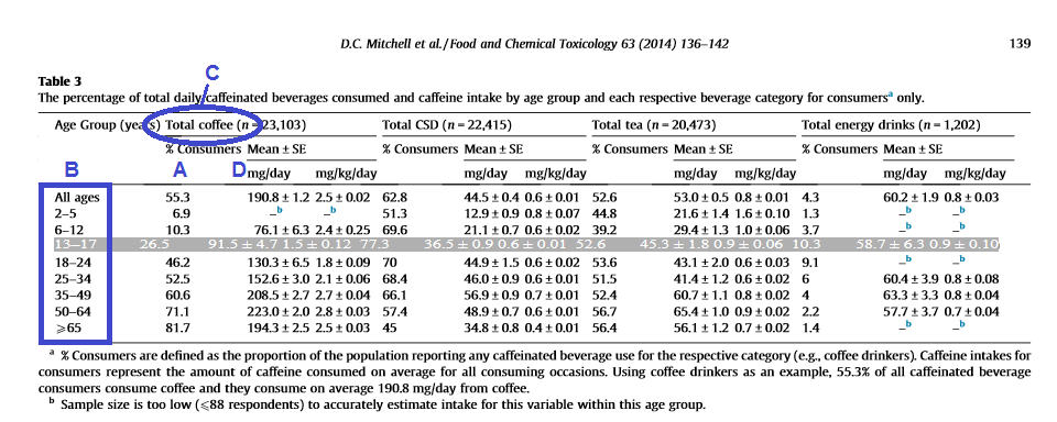 [A]% of all [B] who consume caffeine consume [C], at [D] mg per day on average. (Note: B stays the same, but I’ve only marked the A, D and C columns for coffee)