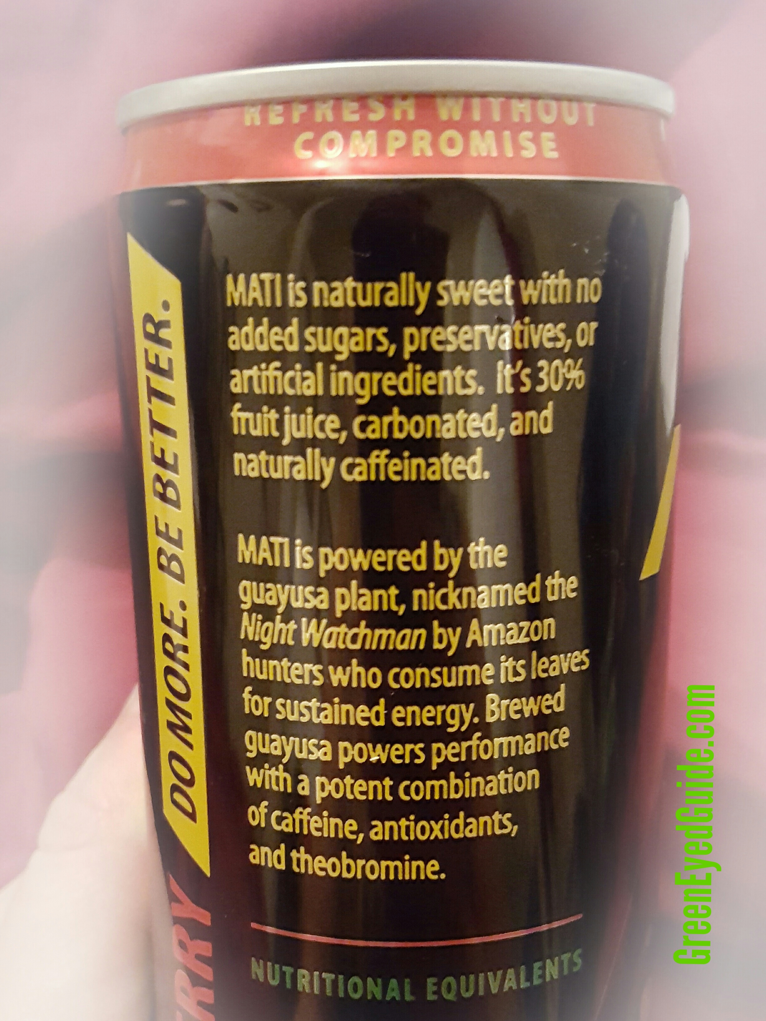 Guayusa leaves contain twice the antioxidants of green tea, and MATI is equivalent to three cups of it, according to the “Nutritional Equivalents” on the can. Guayusa also contains essential amino acids, though the energy drink itself contains only 1 gram of protein. Traditional use of guayusa includes consumption before nighttime hunting trips, as the guayusa gave the hunters mental strength, courage, and focus. It’s not clear what “mental strength” is, exactly, but you can count on almost any caffeine source to increase stamina and focus.